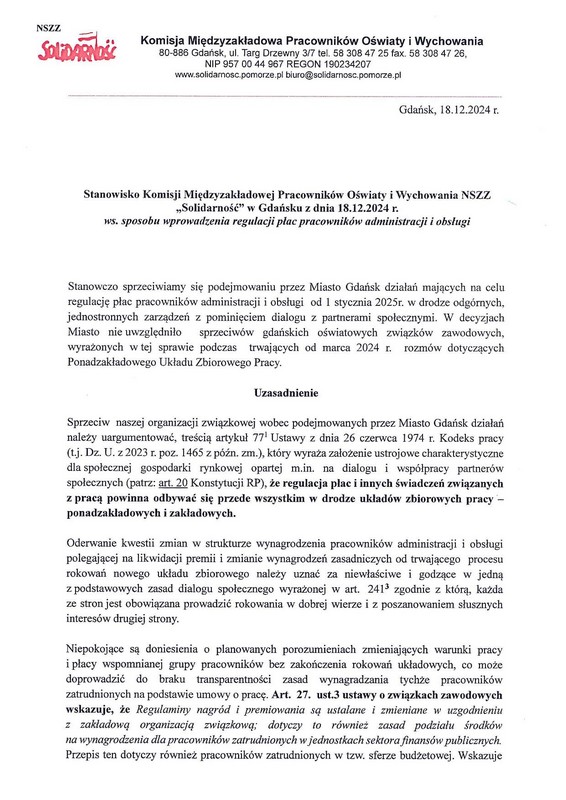 Stanowisko ws. sposobu wprowadzenia regulacji płac
